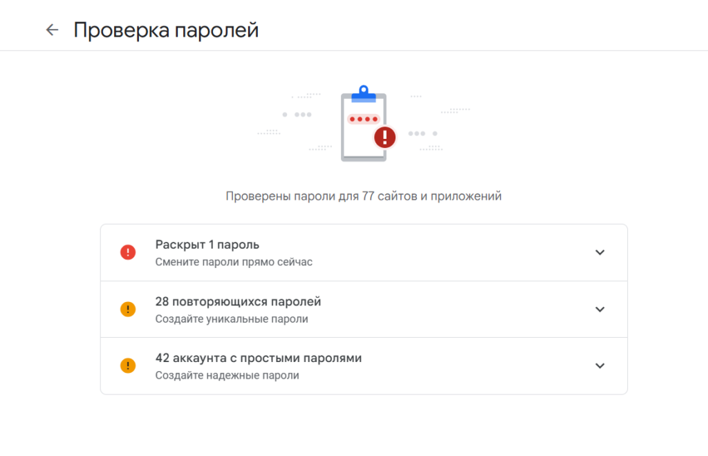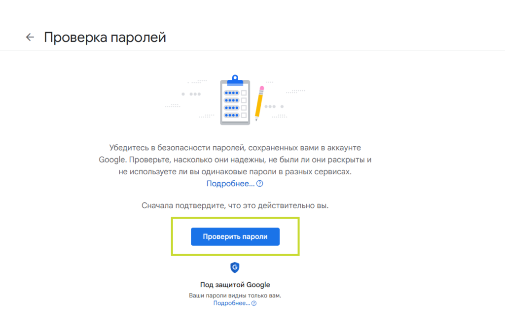 - Перайдзіце ў Google → Менеджар пароляў → «Праверыць» (Check).