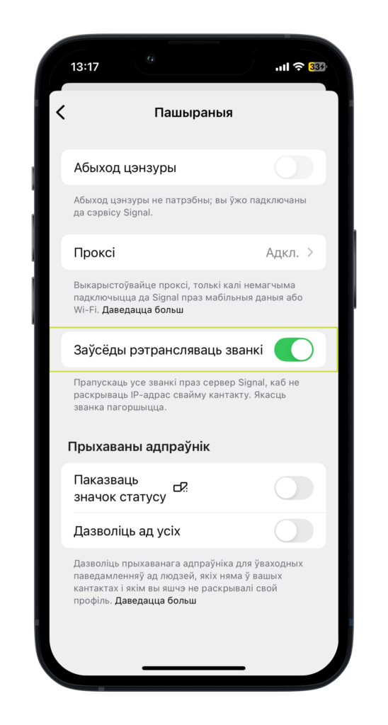 - Каб запабегчы ўцечкі вашага IP-адраса іншым карыстальнікам у час выклікаў, уключыце функцыю «Заўсёды рэтрансляваць званкі».